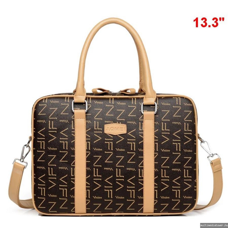 Női notebook táska, feliratos mintával barna alapon. Elegáns viselet,