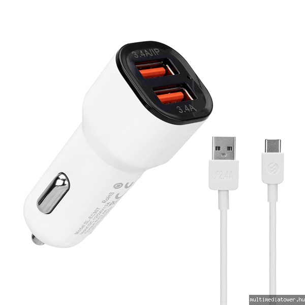 2db USB, 5V/2.4A/3,4A, 17W, Type-C, 100cm adat+töltőkábel, fehér
